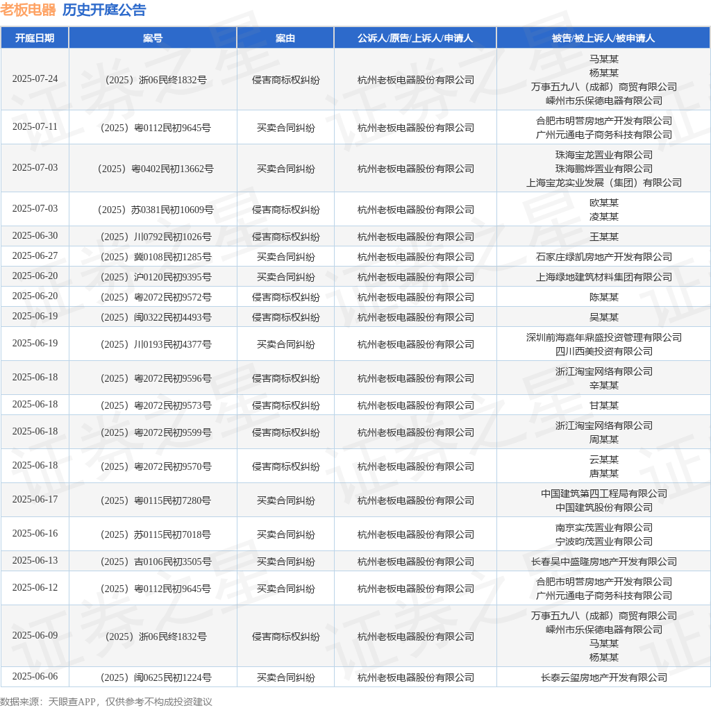 本站消息,根据天眼查APP显示,近日公布了一则杭州老板电器股份有限公司作为原告/上诉人的开庭公告,详细内容如下: